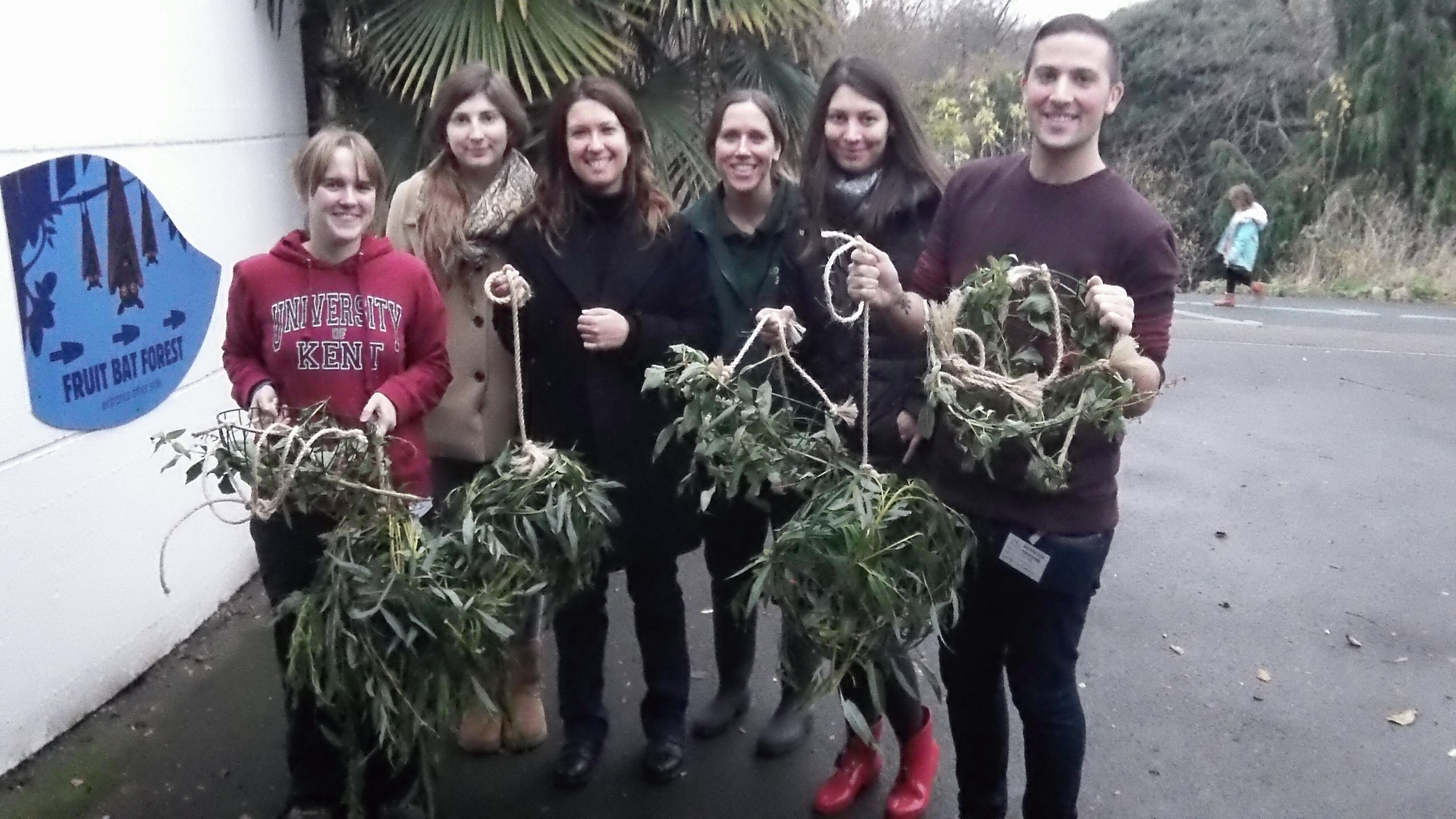 When we arrived we were given a short presentation on the benefits of what we’d be doing for the animals, and how it helps them to maintain the same behavioural patterns as they would have in the wild. For the meerkats we made “Yule logs” which were little wooden logs with hay and worms inside. The benefits of these was so that the meerkats could use their long fingers to root inside the logs and work for their food. For the fruit bats we made hanging baskets with a particular type of flower that they like wound around the basket so that they were able to enjoy a different type of food than they had been having recently.