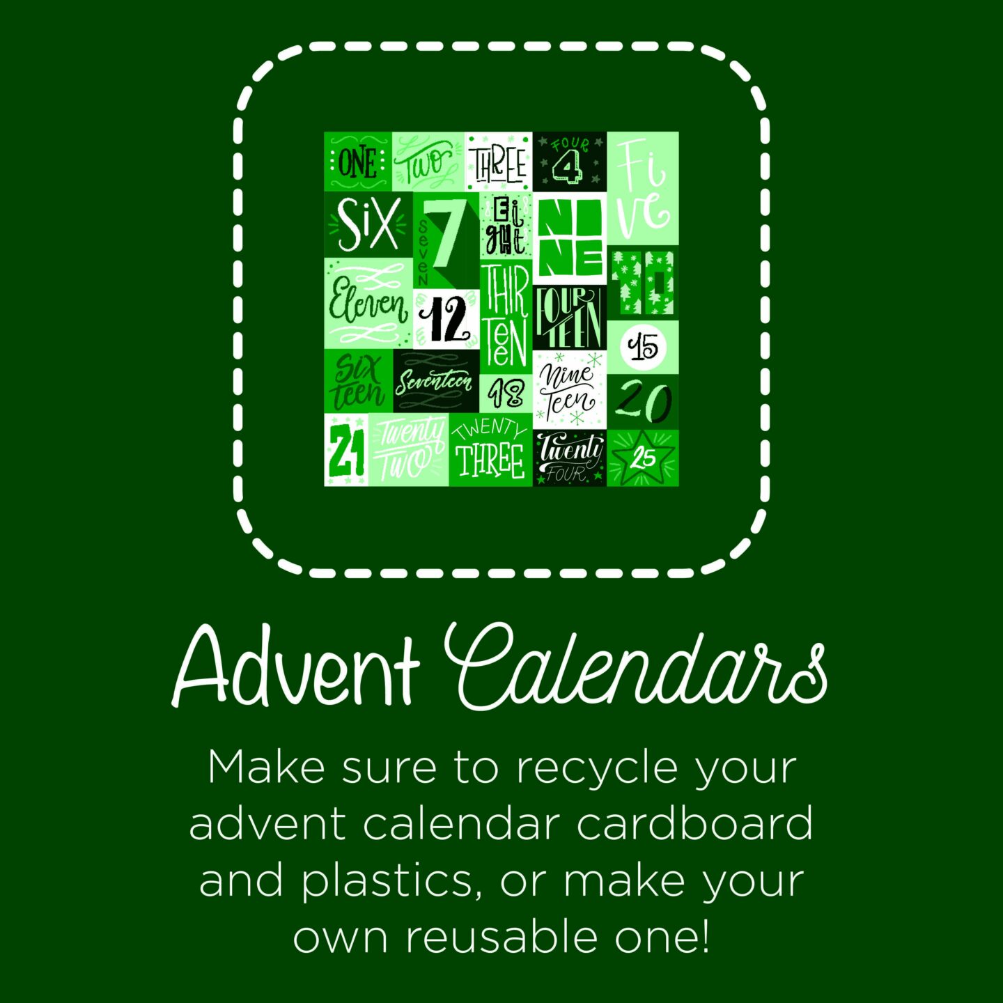 12 Sustainable Days Of Christmas:Day 1: Advent CalendarsMore than 16 million advent calendars were sold in 2019 in the UK! Lots of our advent calendars contain non-recyclable and recyclable materials. So, when the 25th comes, make sure you dispose of the cardboard, wrappers and plastic in the right bin. You can also make your own home-made calendar to gift to a loved one to reduce excess packaging.