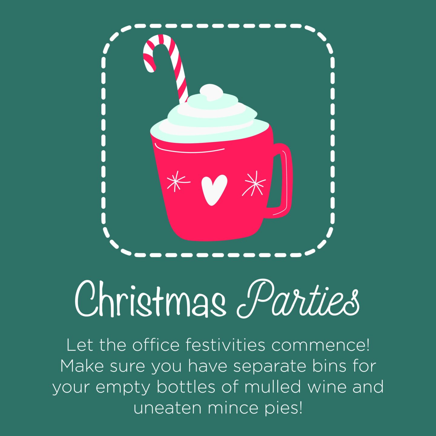 Day 10: Office Christmas PartiesMany will wake up with a sore head after a little too much mulled wine at the office Christmas party. Make sure you give all those bottles a second life by ensuring you separate your glass from your general waste during the festive period. Glass bottles can be infinitely recycled so it’s important we separate this material so there are plenty of bottles for year’s party!