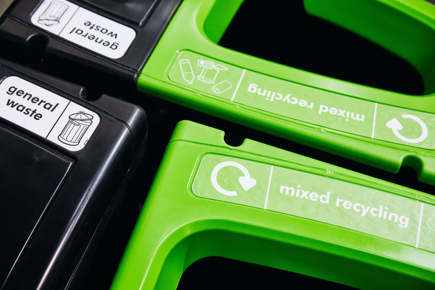 - The number and layout of bins will depend on space you have. We recommend 1 bin for every 15 people to ensure that the correct bin is never too far away