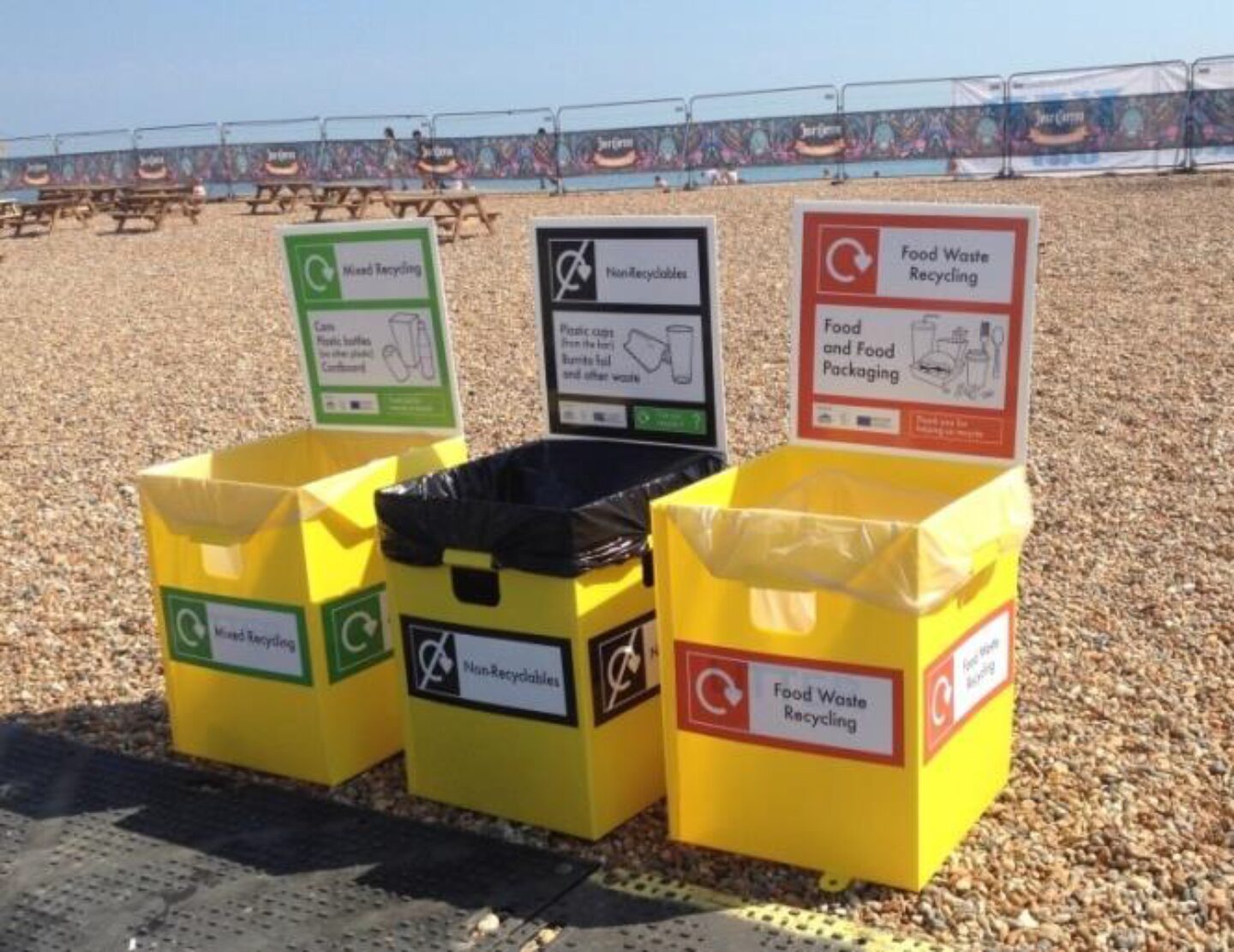 - Waste containers were designed specifically for the event. The large yellow containers worked on the beach where wheelie bins would have fallen over, but they did not work so well for bar areas where lots of people were standing close to them with drinks and could not see the signage on the front.