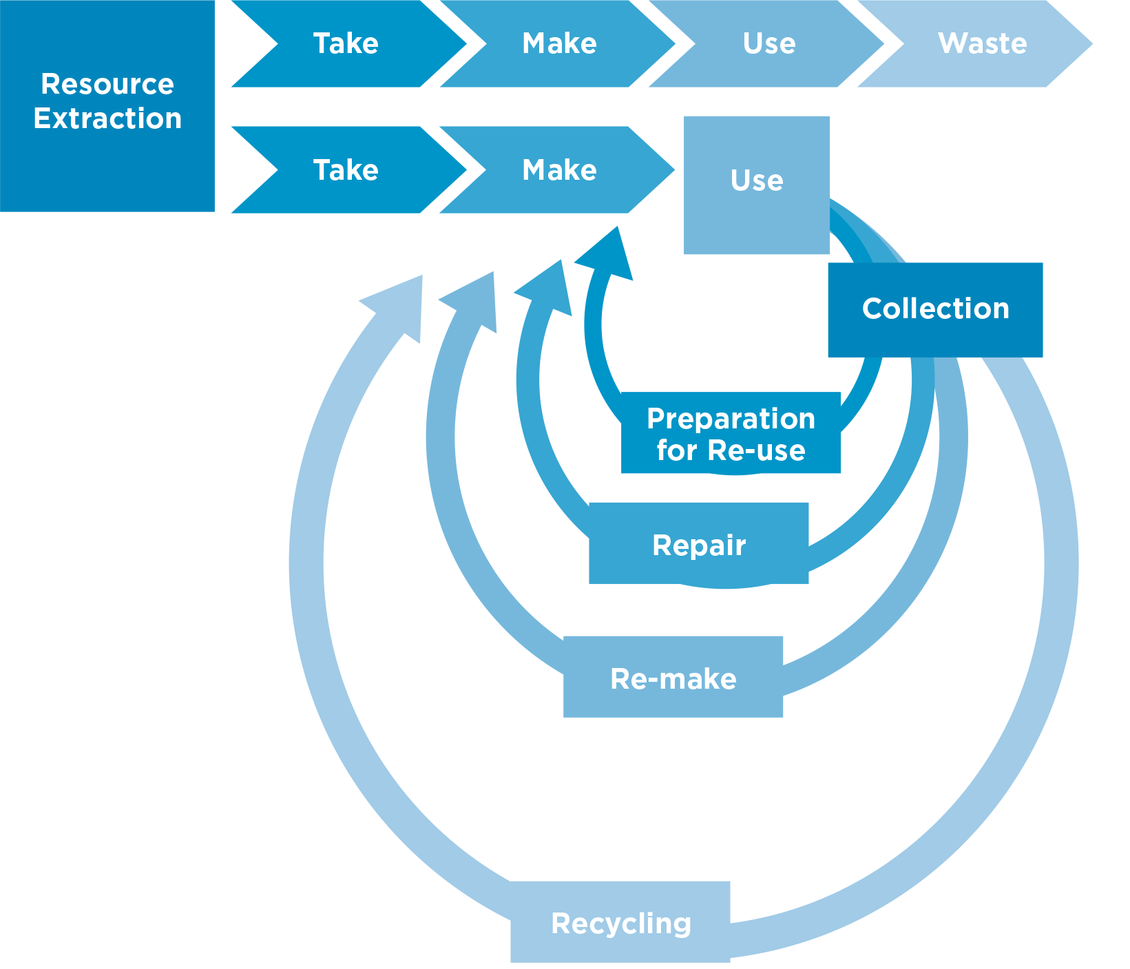 The circular economy uses less raw materials. As global populations increase it is essential we maximise the potential of the available resources. The existing linear economy extracts a huge amount of raw material which is both water and energy inefficient. Manufacturing is similarly inefficient and current processes produce huge amounts of waste and pollution.